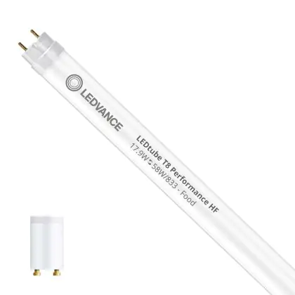 Die T8 LED-Röhren von Ledvance gibt es in verschiedenen Farbtemperaturen: Extra Warmweiß (2.700 K und weniger), Warmweiß (3.000 K), Kaltweiß (4.000 K) und Tageslichtweiß (6.500 K). Diese Röhre strahlt ihr Licht in 3300K - Lebensmittel aus.