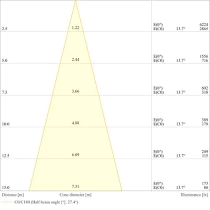 Beispiel: Wird eine Lampe mit einem Abstrahlwinkel von 60 Grad an der Decke (2,5 m Höhe) angebracht, erzeugt sie einen Lichtkegel von 2,9 Metern Durchmesser. Hat die Lampe hingegen einen Abstrahlwinkel von 120 Grad, beträgt der Lichtkegel 8,7 Meter im Durchmesser. |
