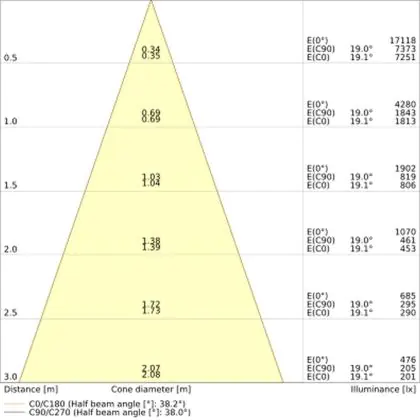 Beispiel: Wird eine Lampe mit einem Abstrahlwinkel von 60 Grad an der Decke (2,5 m Höhe) angebracht, erzeugt sie einen Lichtkegel von 2,9 Metern Durchmesser. Hat die Lampe hingegen einen Abstrahlwinkel von 120 Grad, beträgt der Lichtkegel 8,7 Meter im Durchmesser. |
