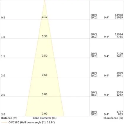 Beispiel: Wird eine Lampe mit einem Abstrahlwinkel von 60 Grad an der Decke (2,5 m Höhe) angebracht, erzeugt sie einen Lichtkegel von 2,9 Metern Durchmesser. Hat die Lampe hingegen einen Abstrahlwinkel von 120 Grad, beträgt der Lichtkegel 8,7 Meter im Durchmesser. |