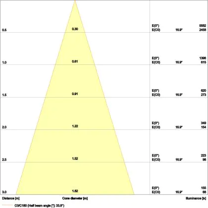 Beispiel: Wird eine Lampe mit einem Abstrahlwinkel von 60 Grad an der Decke (2,5 m Höhe) angebracht, erzeugt sie einen Lichtkegel von 2,9 Metern Durchmesser. Hat die Lampe hingegen einen Abstrahlwinkel von 120 Grad, beträgt der Lichtkegel 8,7 Meter im Durchmesser. |