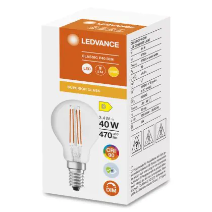 Die Ledvance Superior Classic LED E14 Kugel Fadenlampe Klar 3.4W 470lm - 927 Extra Warmweiß | Dimmbar - Höchste Farbwiedergabe ist eine effiziente E14 LED-Lampe mit Retrodesign und der perfekte Ersatz für Ihre konventionellen 40W Lampen mit E14. Zudem strahlt sie Licht in der Farbtemperatur 2700K - Extra Warmweiß aus und punktet durch eine lange Lebensdauer.