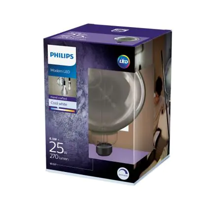 Die Philips Classic LED Globe E27 200mm Fadenlampe Smoke 6.5W 200lm - 818 Extra Warmweiß | Dimmbar - Ersatz für 20W ist eine effiziente E27 LED-Lampe mit Retrodesign und der perfekte Ersatz für Ihre konventionellen 20W Lampen mit E27. Zudem strahlt sie Licht in der Farbtemperatur 1800K - Extra Warmweiß aus und punktet durch eine lange Lebensdauer.