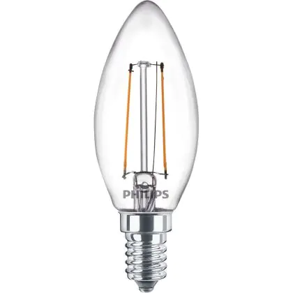 Die Philips Corepro LED Kerze E14 Fadenlampe Klar 2W 250lm – 840 Kaltweiß | Ersatz für 25W ist eine effiziente E14 LED-Lampe mit Retrodesign und der perfekte Ersatz für Ihre konventionellen 25W Lampen mit E14. Zudem strahlt sie Licht in der Farbtemperatur 4000K - Kaltweiß aus und punktet durch eine lange Lebensdauer.